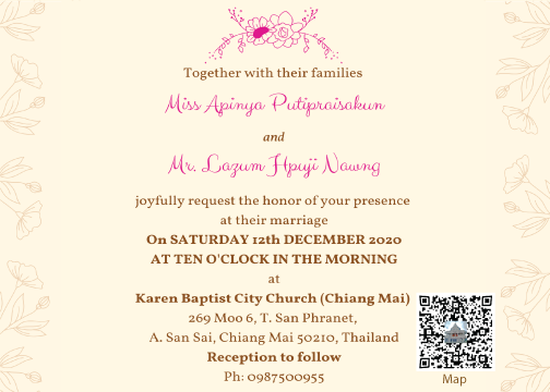 Our first meeting is on the first day when I joined AIPP as an IT officer. Apinya has already been working with Asia Indigenous Peoples Pact (AIPP) in the finance section before I joined in. We have been working together since the day I joined AIPP. Although we work in different fields, our deep feeling on IP issues and a good understanding of each other bring us together and closer, and eventually, natural love for each other has been developed within ourselves. We have finally agreed and decided to be the life partner as husband-wife by organizing a wedding program on 12th December 2020. We dream to have a divine shower through the blessing of you where we always can feel blessed in our entire conjugal life.