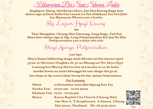 The son of Mr. Lazum La Doi (Dakkasu Tsa Doi) and Mrs. Hpauyam Hkawn who stay at Jan Mai Kawng District, Myitkyina City, Kachin State in Myanmar.